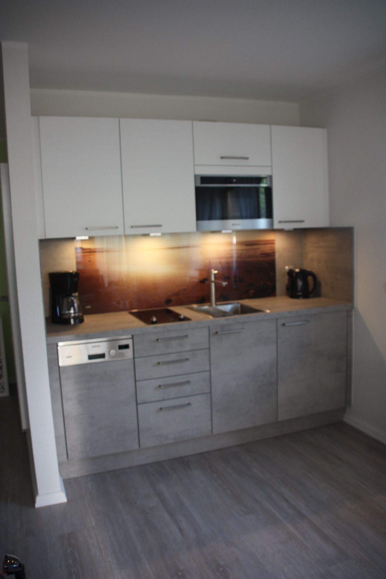 Es schließt sich ein Essbereich mit der Küchenzeile an, die mit allen wichtigen Geräten wie Kühlschrank, Spülmaschine, kl. Herdfeld, Kaffeemaschine, Wasserkocher, Toaster, Eierkocher, Mikrowelle, Nespressomaschine etc. ausgestattet ist. Die Küche ist im Juni 2020 neu eingebaut worden.